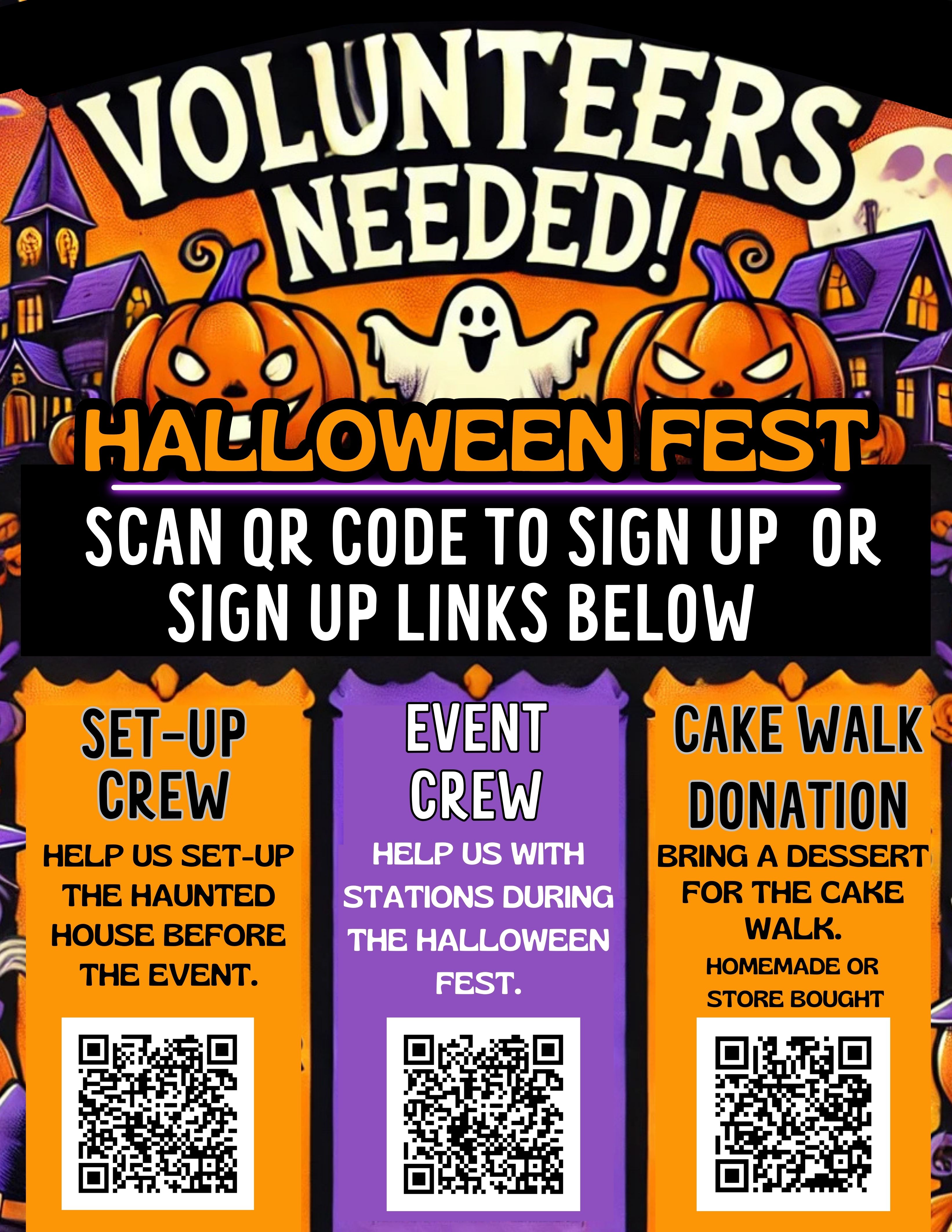 Our 1st Annual Halloween Fest is quickly approaching on Wednesday, October 30th from 4–7 PM at the High School Cafeteria. To make this event a spooktacular success, we need your help to make this event great!You can sign up to volunteer using the QR code on the flyer or the Sign Up Genius links below.